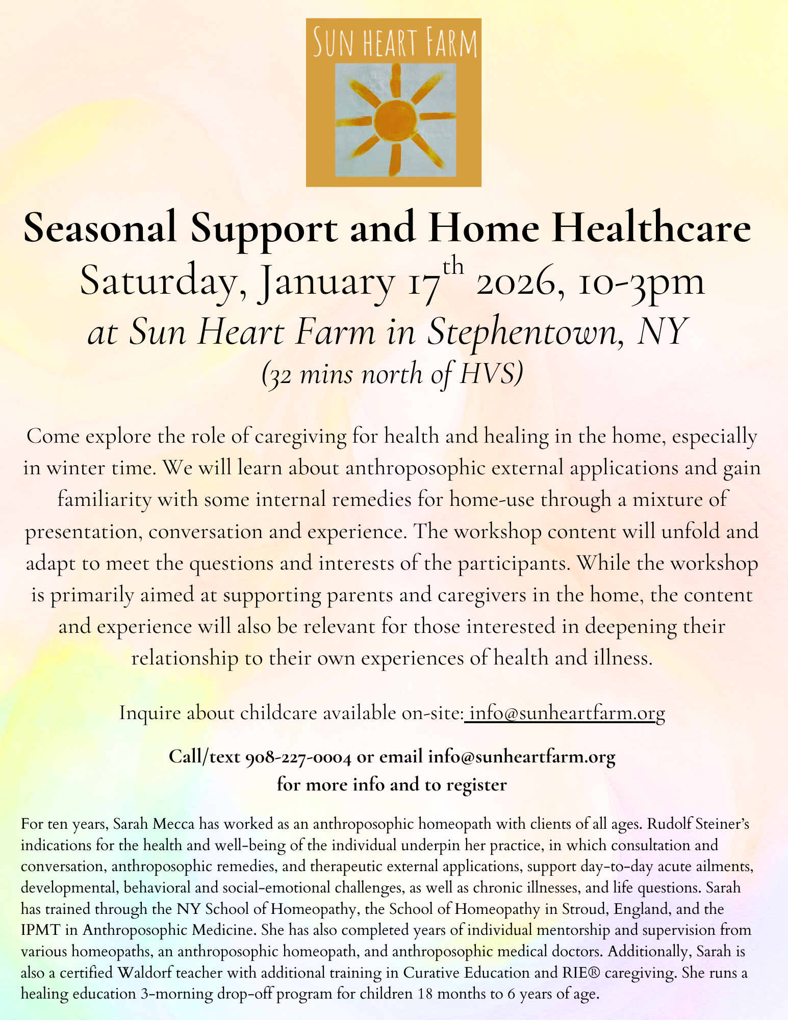Back to All Events Seasonal support & home healthcare WORKSHOP Saturday, January 17, 2026 10:00 AM 4:00 PM Sun Heart Farm 15367 State Route 22 Stephentown United States (map) Google Calendar ICS